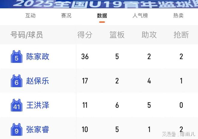 本场比赛,广东U19男篮展现出了令人惊喜的阵容深度。在杨溢缺阵的情况下,球队依旧能够打出行云流水的整体进攻,防守端也保持了高强度压迫。作为中国U19男篮的队内得分王,陈家政本场比赛在22分钟的出场时间内,20中14疯狂砍下36分,并送出5个篮板2次助攻和2次抢断的数据。尤其在第一节比赛中,陈家政里突外投独取18分(对手吉林队全队只有7分),几乎以一己之力彻底撕碎了吉林队的整个防线。无论是外线的干拔三分,还是突破到内线的高难度终结,陈家政都展现出了超越同龄人的成熟终结能力与得分爆发力。